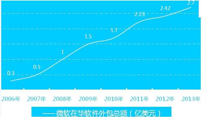 -過(guò)去幾年里,微軟持續(xù)增加對(duì)中國(guó)的全球軟件外包支出,具體金額從2006財(cái)年的3,000萬(wàn)美元飆升至2013財(cái)年的2.7億美元(如下圖),僅七年時(shí)間便增長(zhǎng)了9倍。